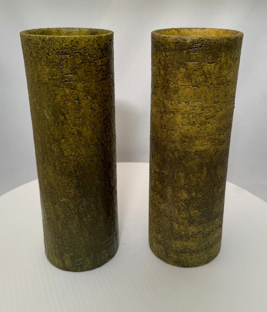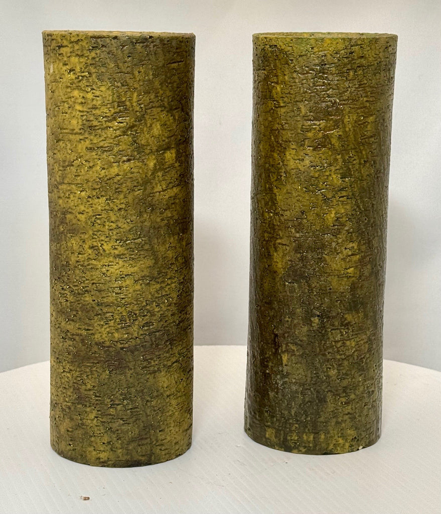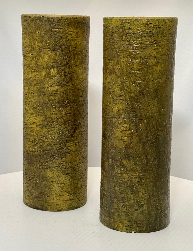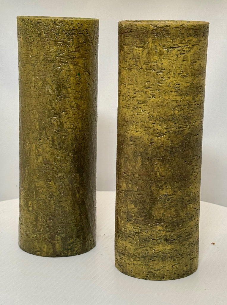 Pair of Marcello Fantoni Green Glazed Cylinder Vases, 1960's, painted marks Fantoni / ITALY in white. This pair is very much in the Brutalist manner fashionable at the time. The finish is textured and the deep mottled green colour emphasises the roughness intended by the artist.