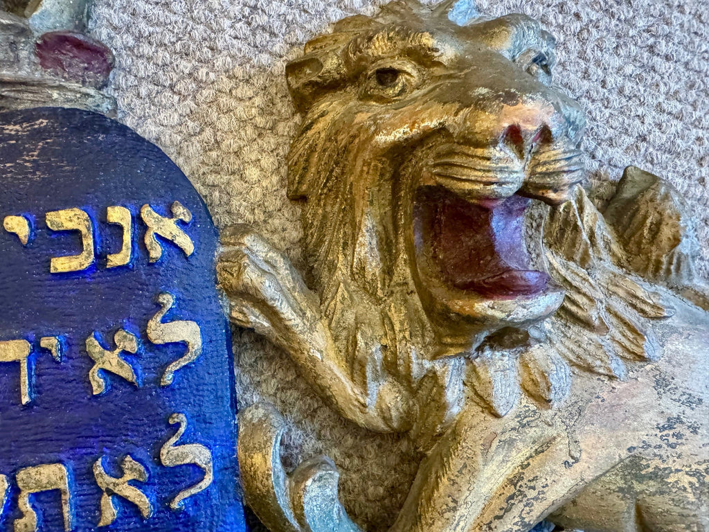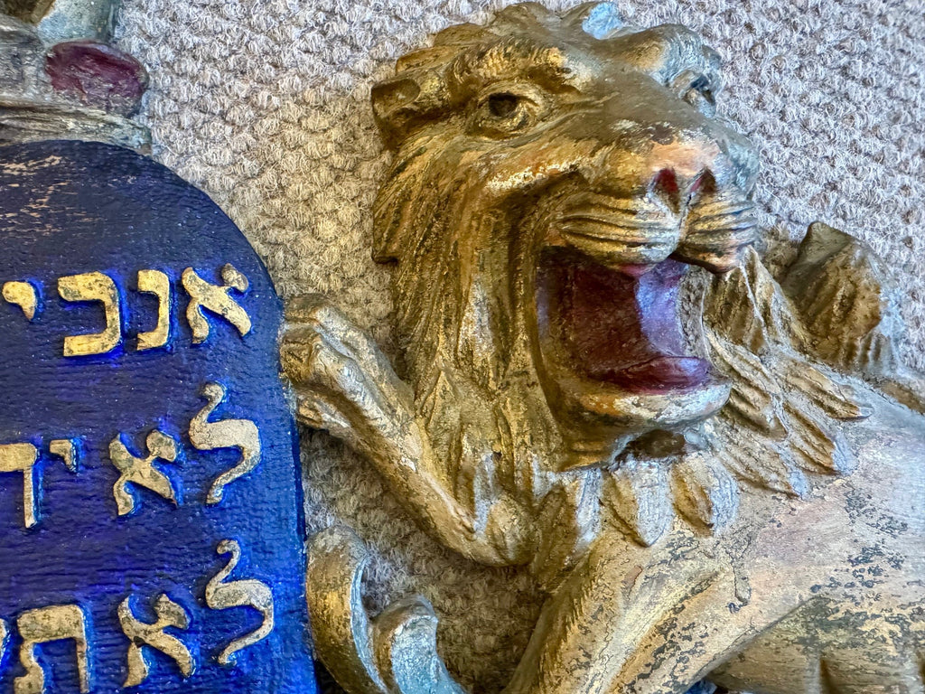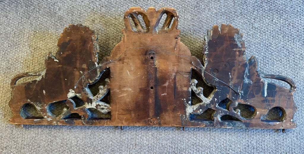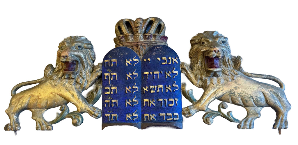 This unusual pediment is from the top of an ark, it is original down to the pegs that would attach it except a very minor refreshing of the blue paint. The tablets are carved in relief on a matted ground. The carver knew his business and gave the words and numbers due emphasis by so doing. There are a few others known in a variety of sizes. with variations of the foliage…some without the crown.