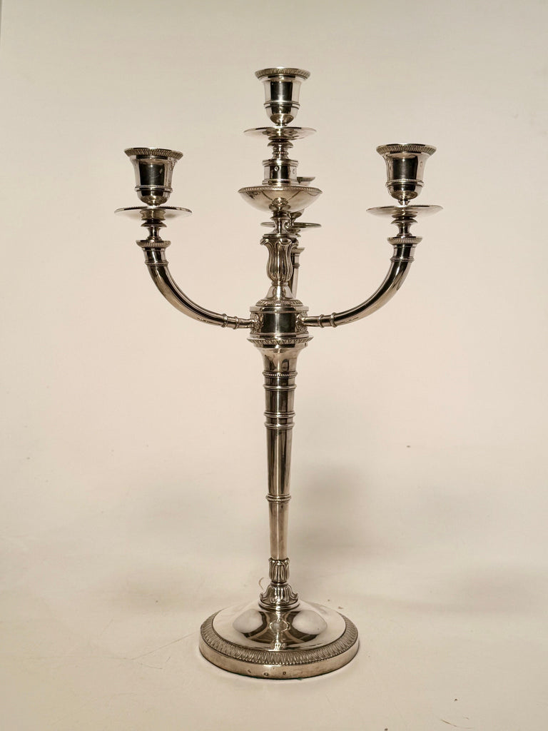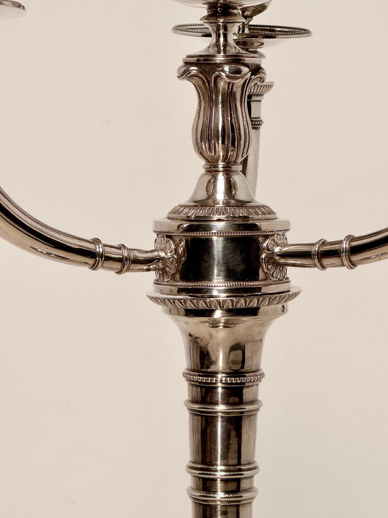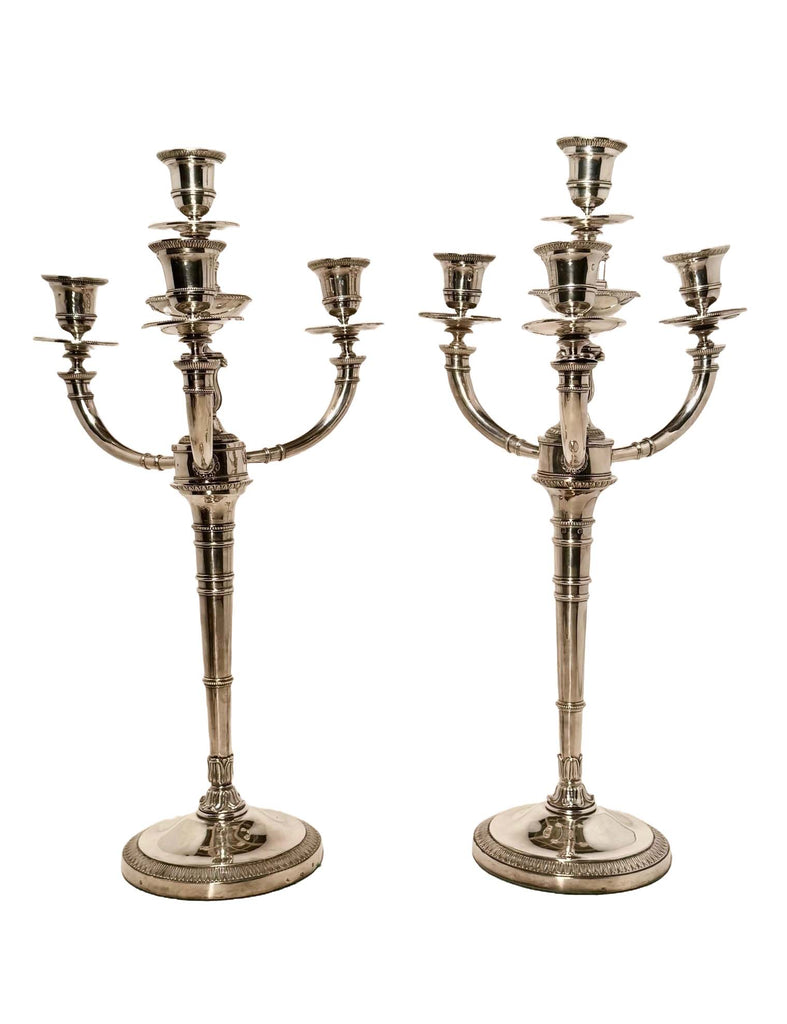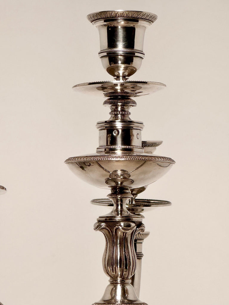 The pair, on circular bases each decorated with a band of stylized acanthus, the tapered stem is plain, adorned with palm leaf motifs and molded bands, the three branches, and central stem are decorated with engraved acanthus leaves, a motif repeated on the Medici vase-shaped bobeches.