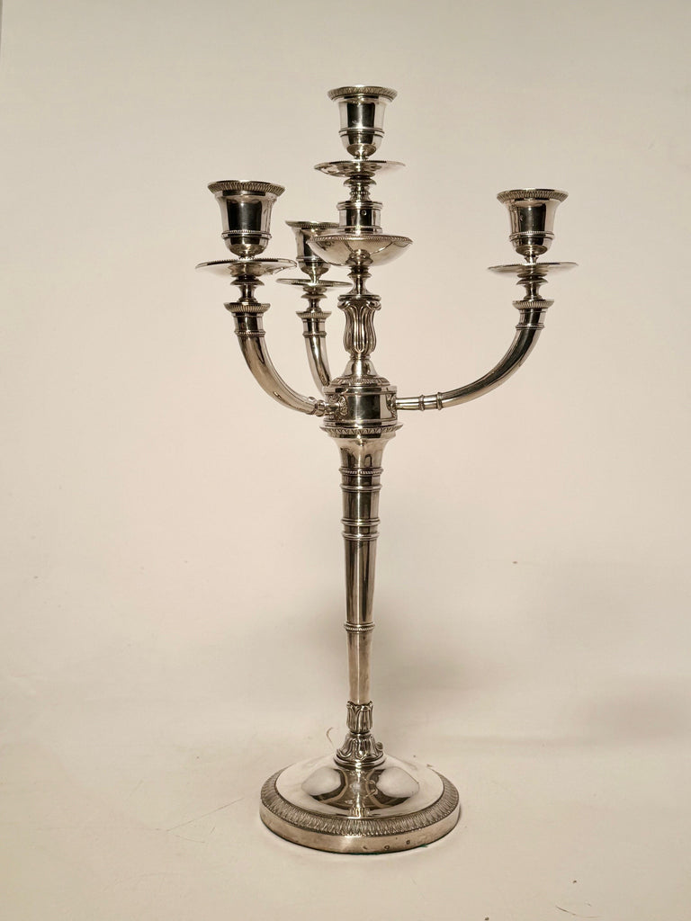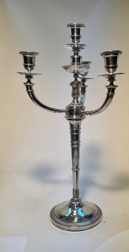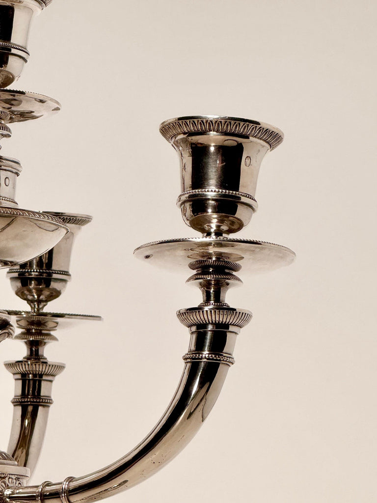 Silver marks on the base, on the branches, and on the bobeches. Some bobeches marked Paris 1809-1819.