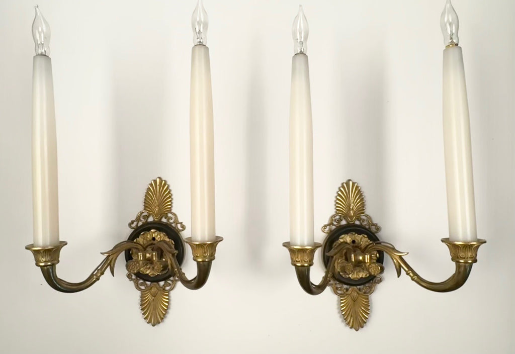 This attractive pair in the Empire style, with palmette decorated backplates and stylised sconces are centered on black circular panels with gilt raised ornament.
