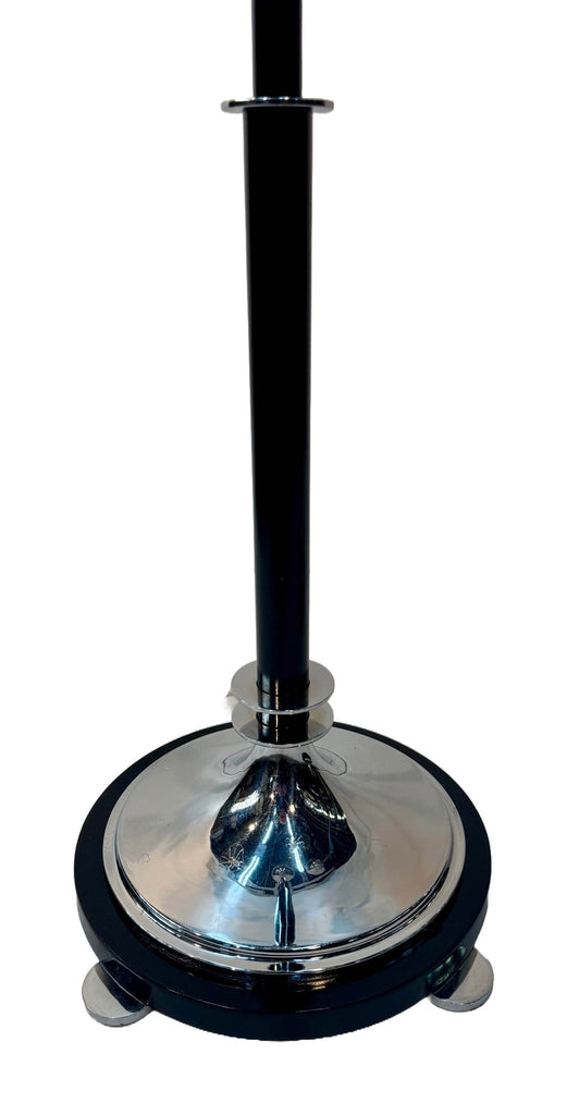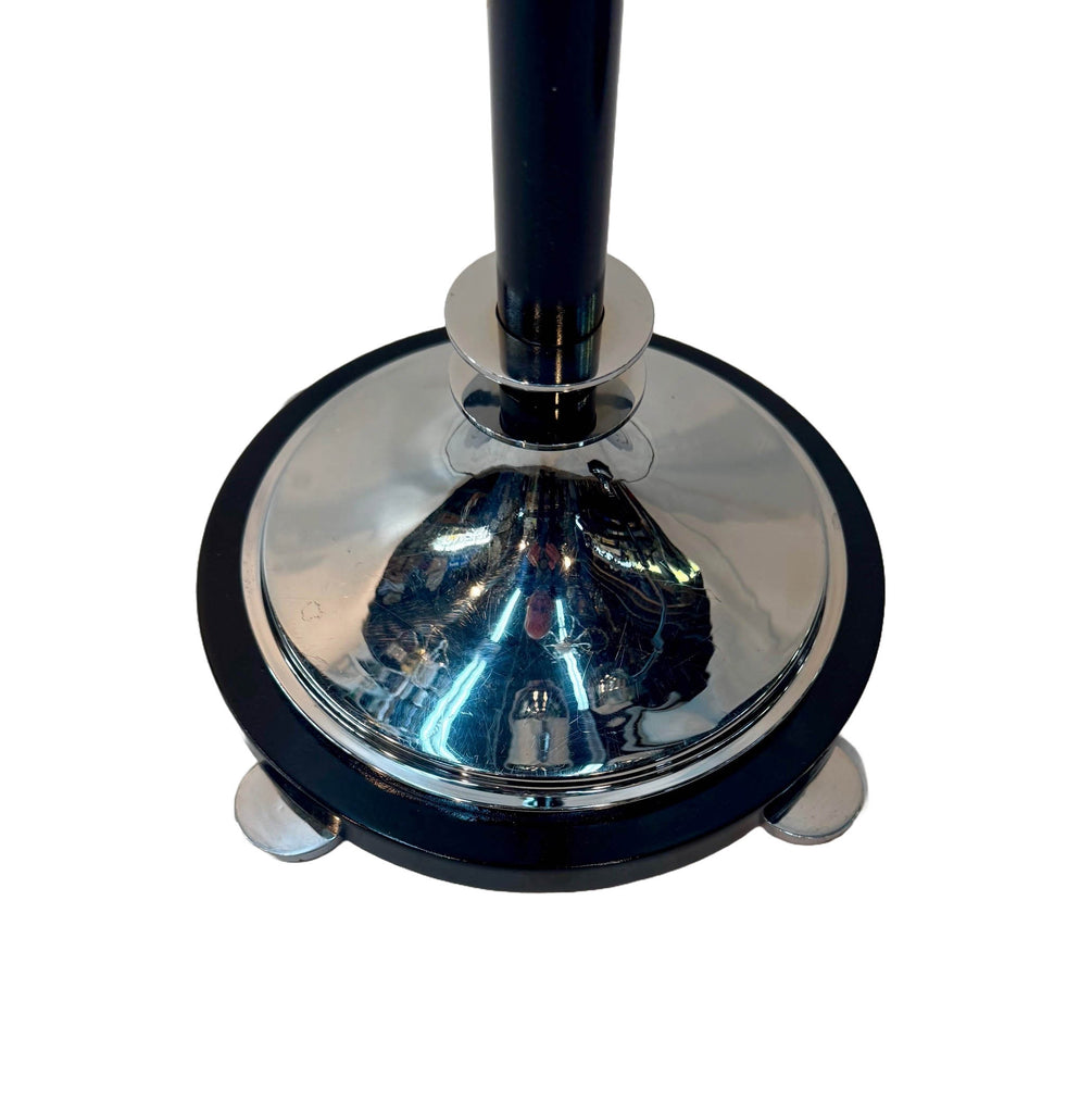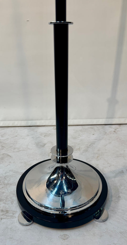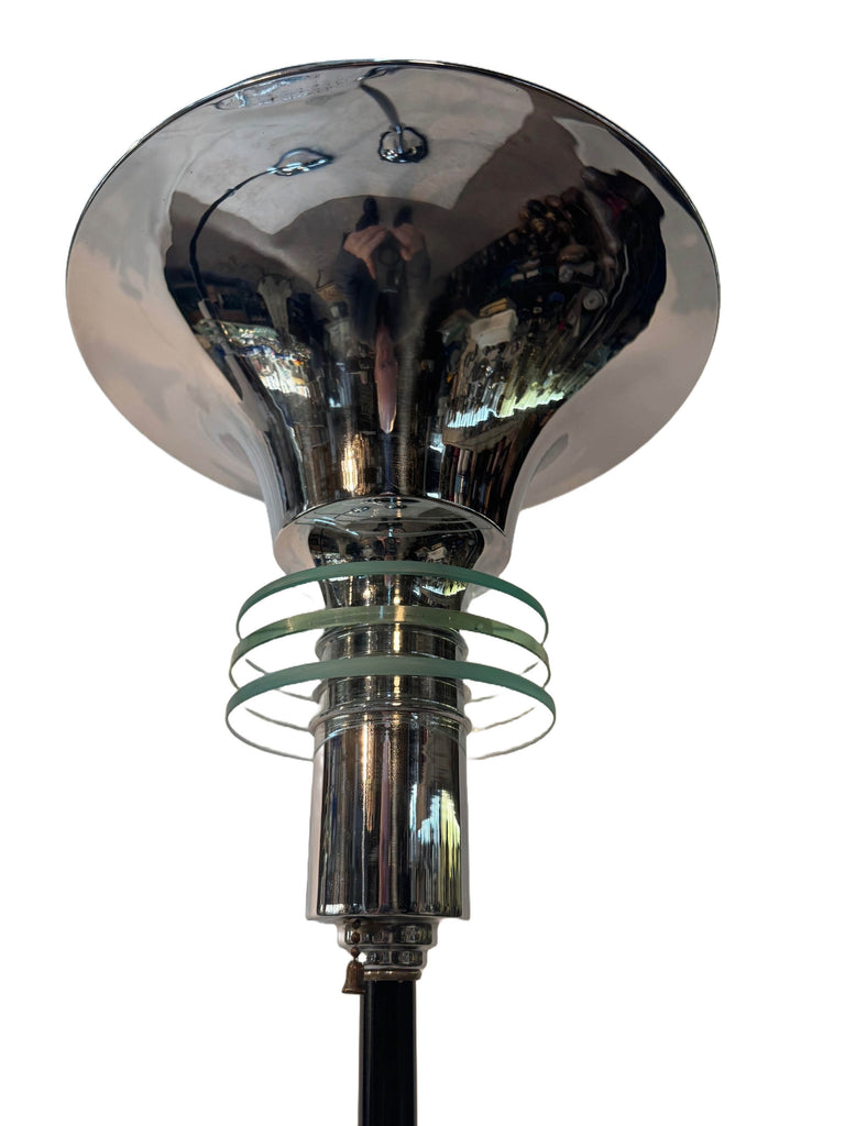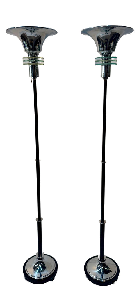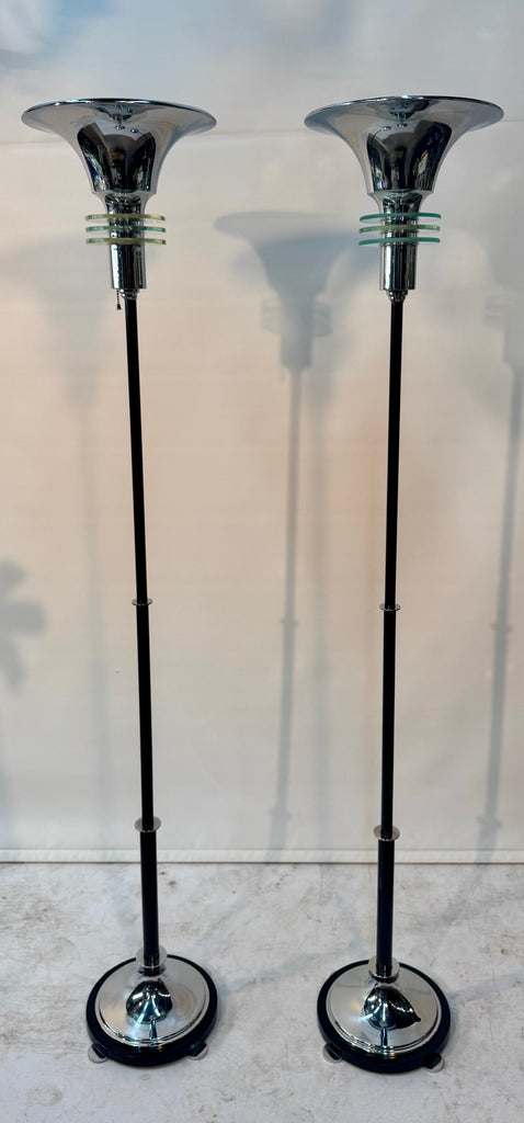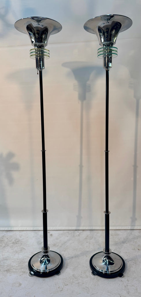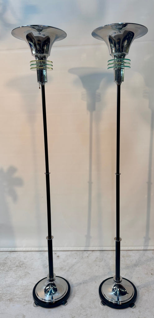 A Pair of Period American Art Deco Torchieres, each with slender black enamelled pedestal; the cast-iron circular baseplate with impressed mark “Electo Mfg Co.” has a nickel-silver domed cover. The pole, in three graduated sections, each separated by nickel-silver spacers supports the matching nickel-silver trumpet-shaped shades, above three cut-glass bands. The pull chains hang from the bottom of the shades.