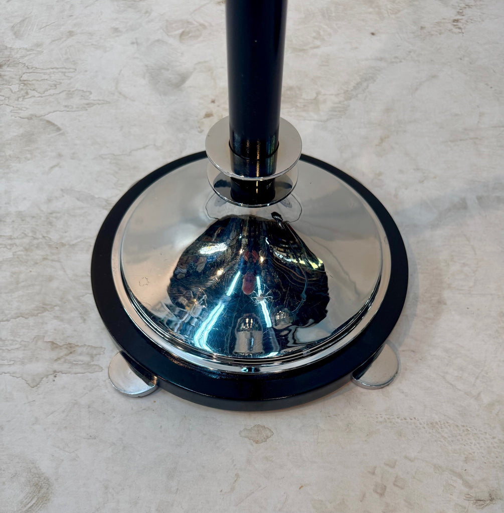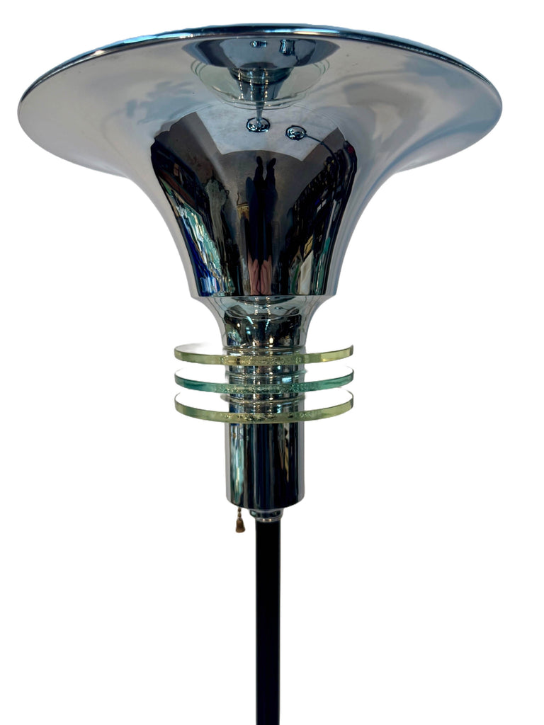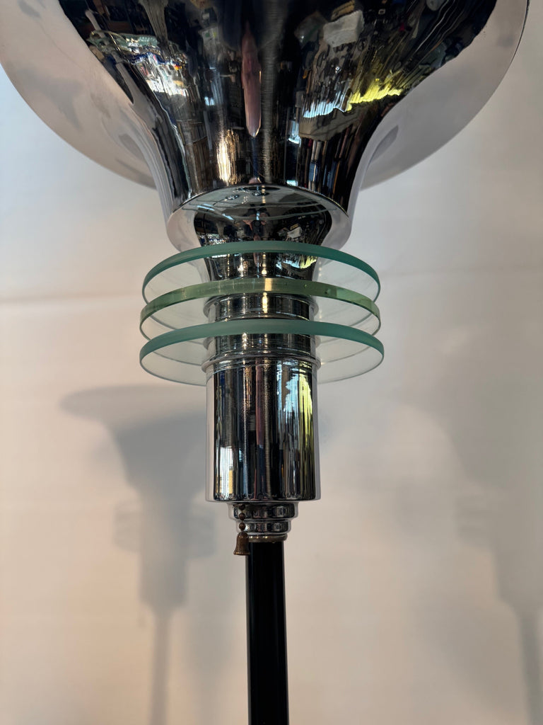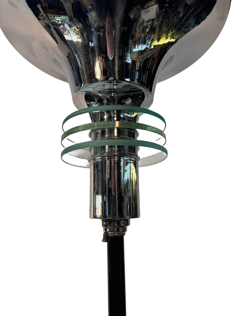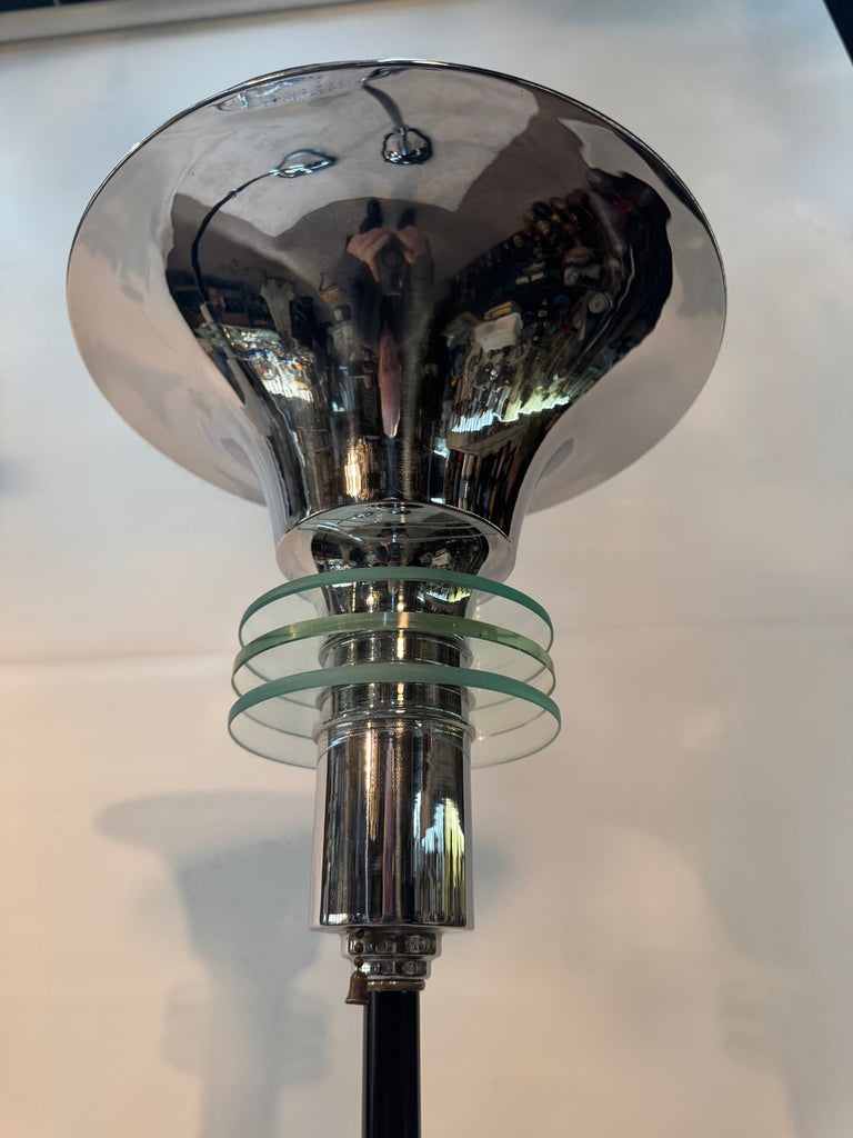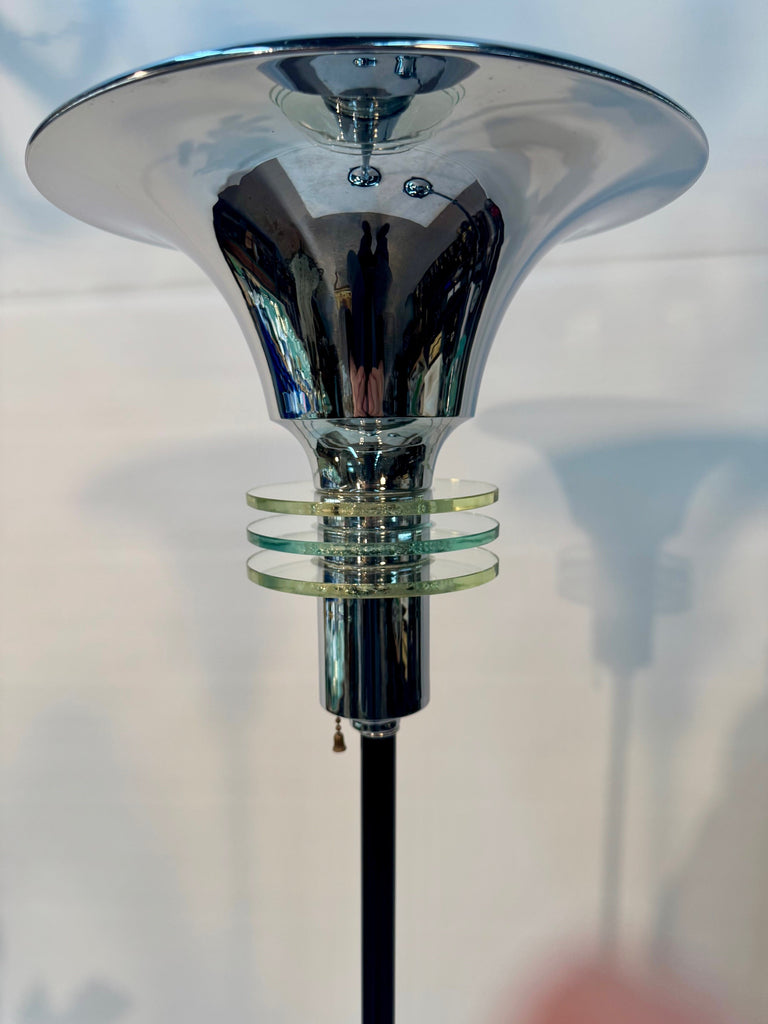 A Pair of Period American Art Deco Torchieres, each with slender black enamelled pedestal; the cast-iron circular baseplate with impressed mark “Electo Mfg Co.” has a nickel-silver domed cover. The pole, in three graduated sections, each separated by nickel-silver spacers supports the matching nickel-silver trumpet-shaped shades, above three cut-glass bands. The pull chains hang from the bottom of the shades.