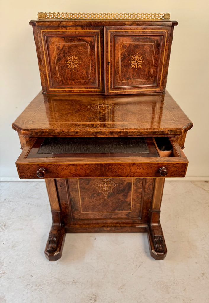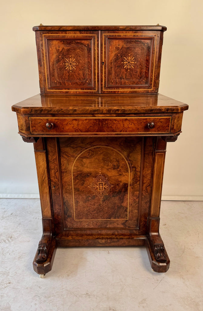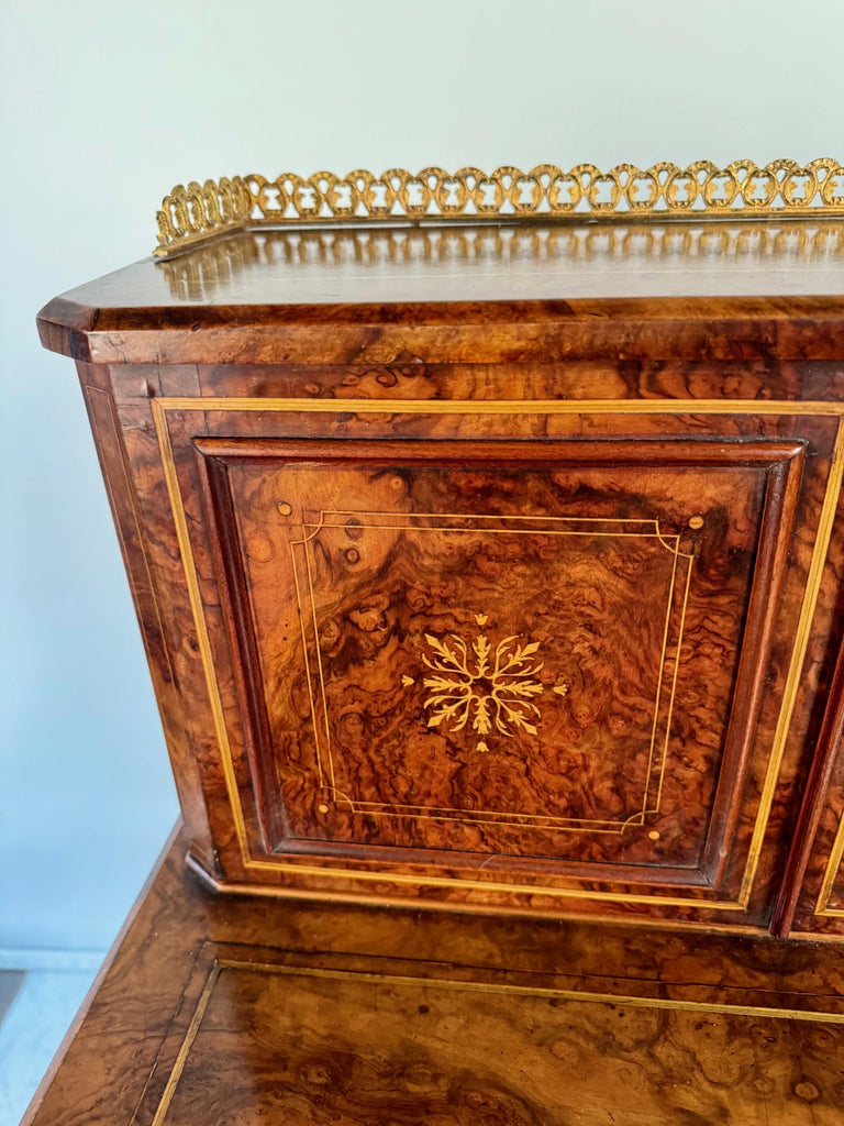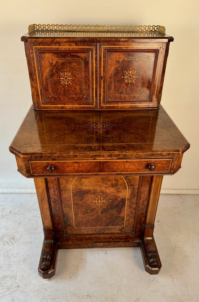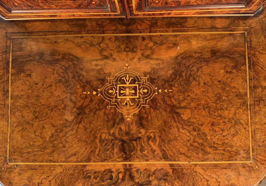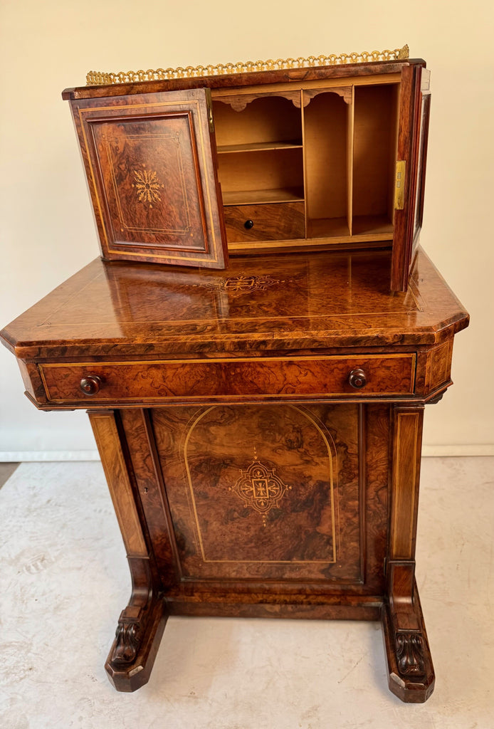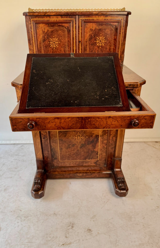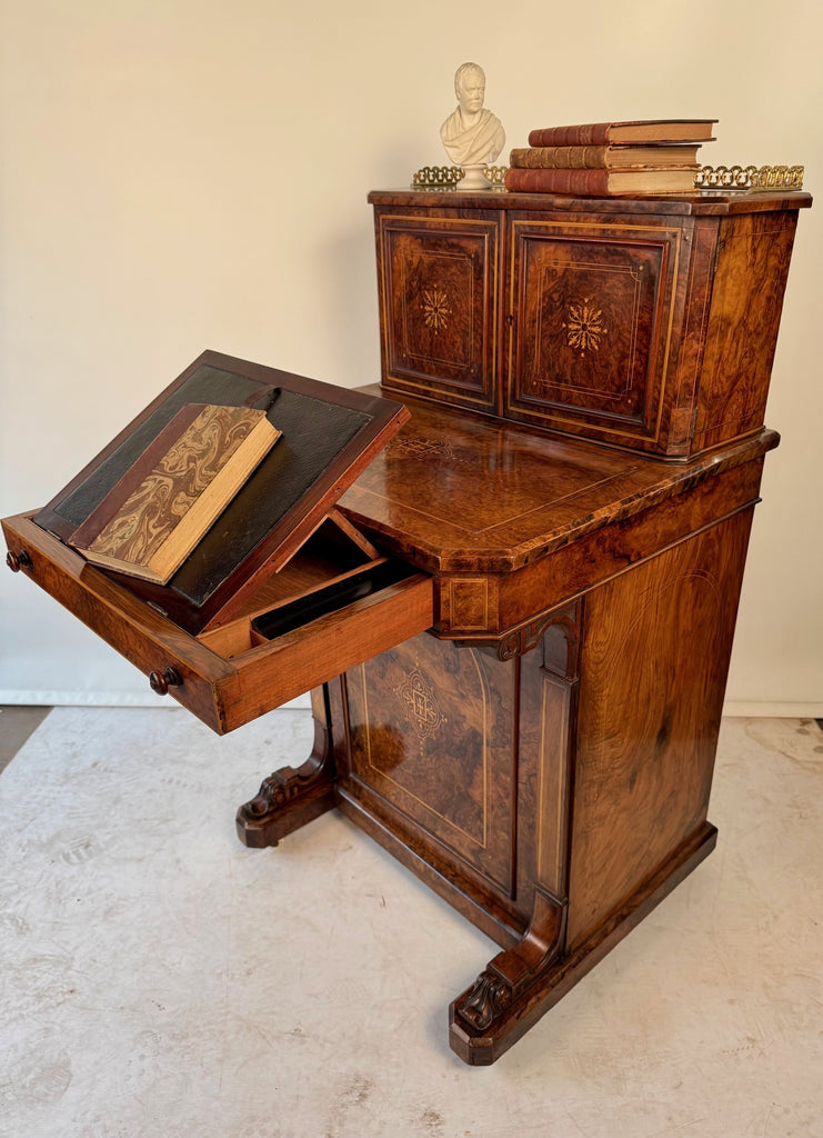 This desk is both highly decorative and unusually functional. The well-figured walnut is complemented by delicate inlays. It is diminutive and interestingly designed. Instead of a fixed writing slope, the frieze drawer pulls out to reveal a leather writing surface that can be raised or lowered for reading or writing, supported by a movable strut. When the drawer is closed the surface is flat and suitable for a lamp or ornament. The superstructure is enclosed by panelled doors and surmounted by a pierced gallery. The lower cupboard is fitted with shelves. As a desk or bedside cabinet it would a striking and unusual addition to any room.