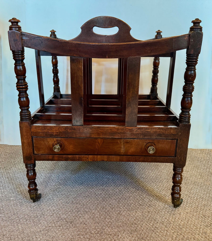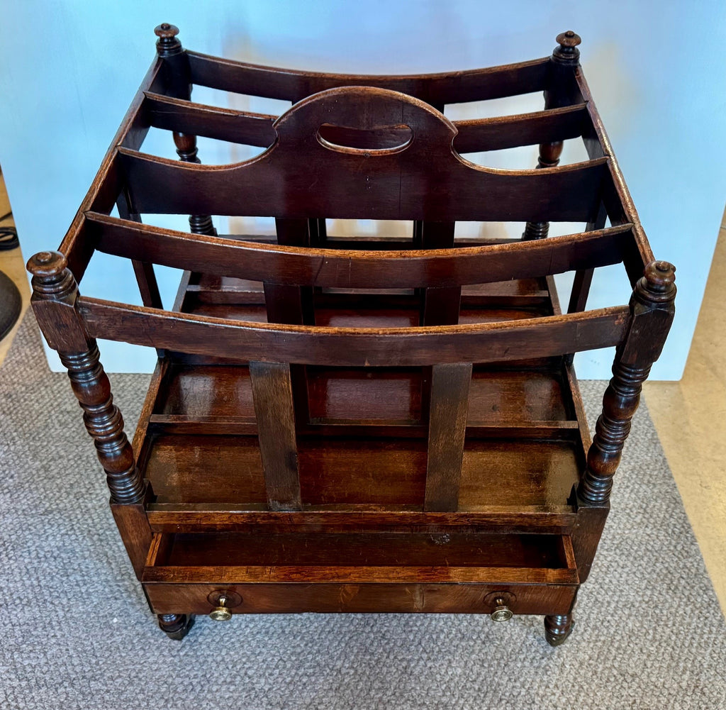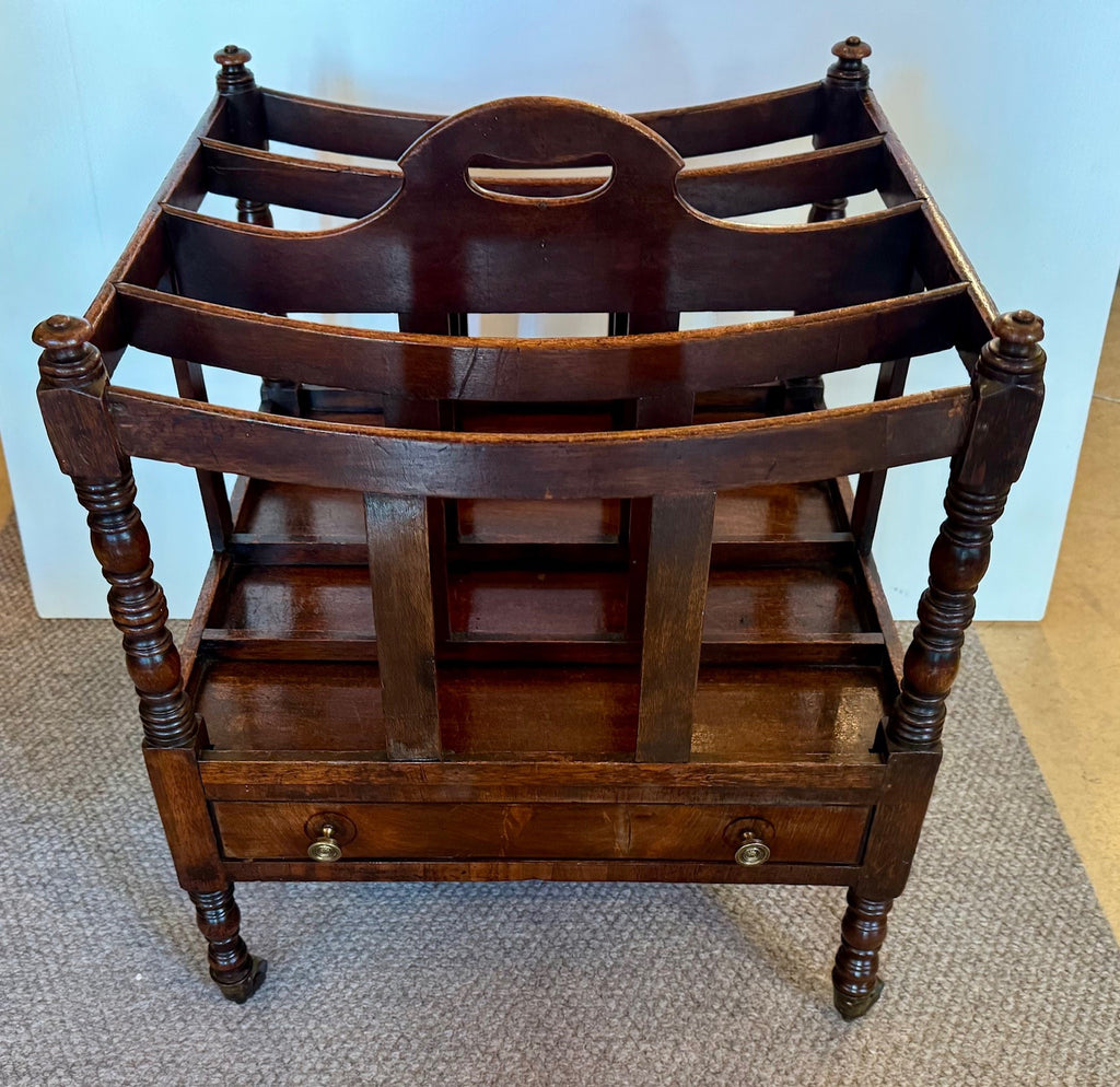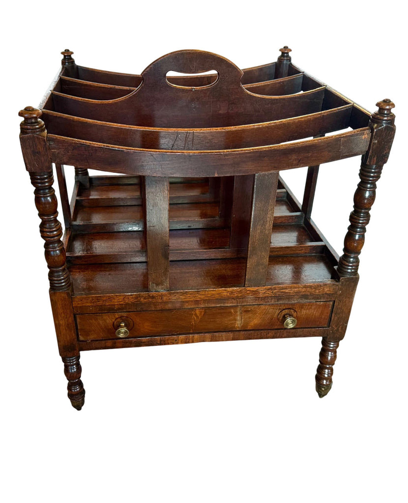 The Canterbury appears early in the 19th century for sheet music and papers and continues until now in some form. This example has neatly turned uprights. It has a single drawer beneath the magazine racks and retains the original cappings and casters. The form is "boat shaped" with the top rail of the dividers bowed to add a touch of elegance.