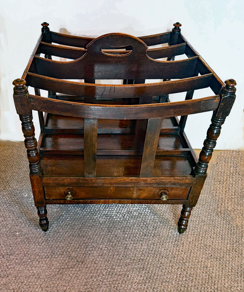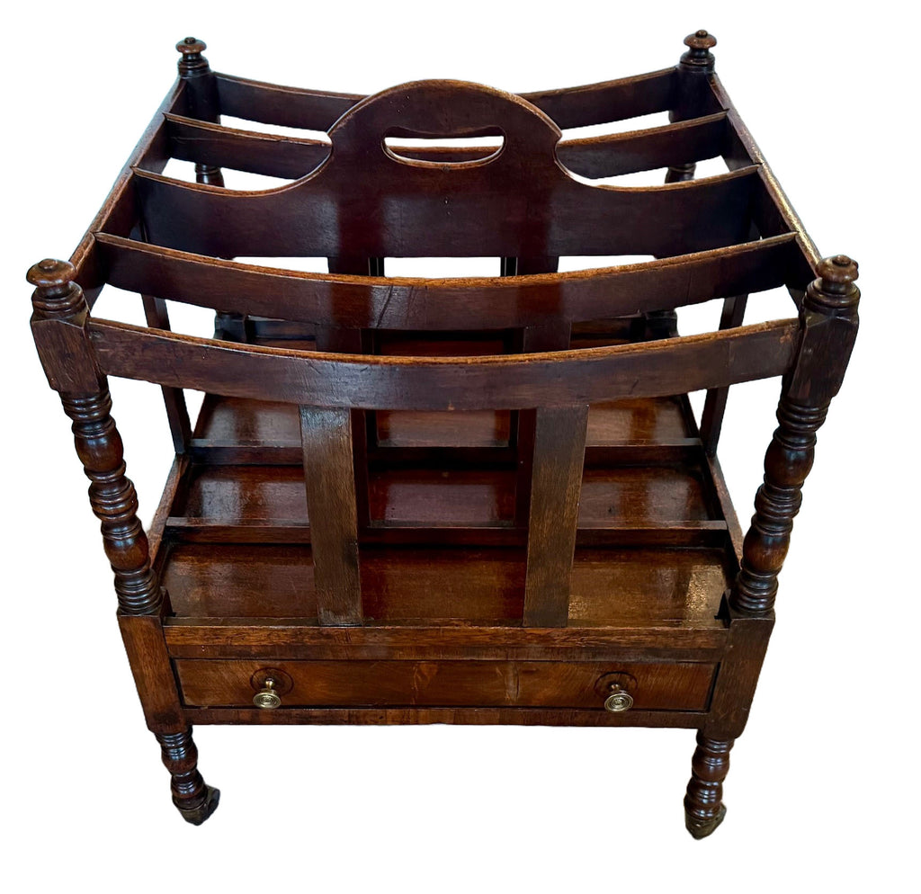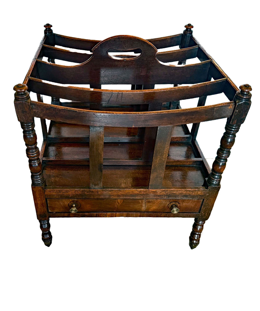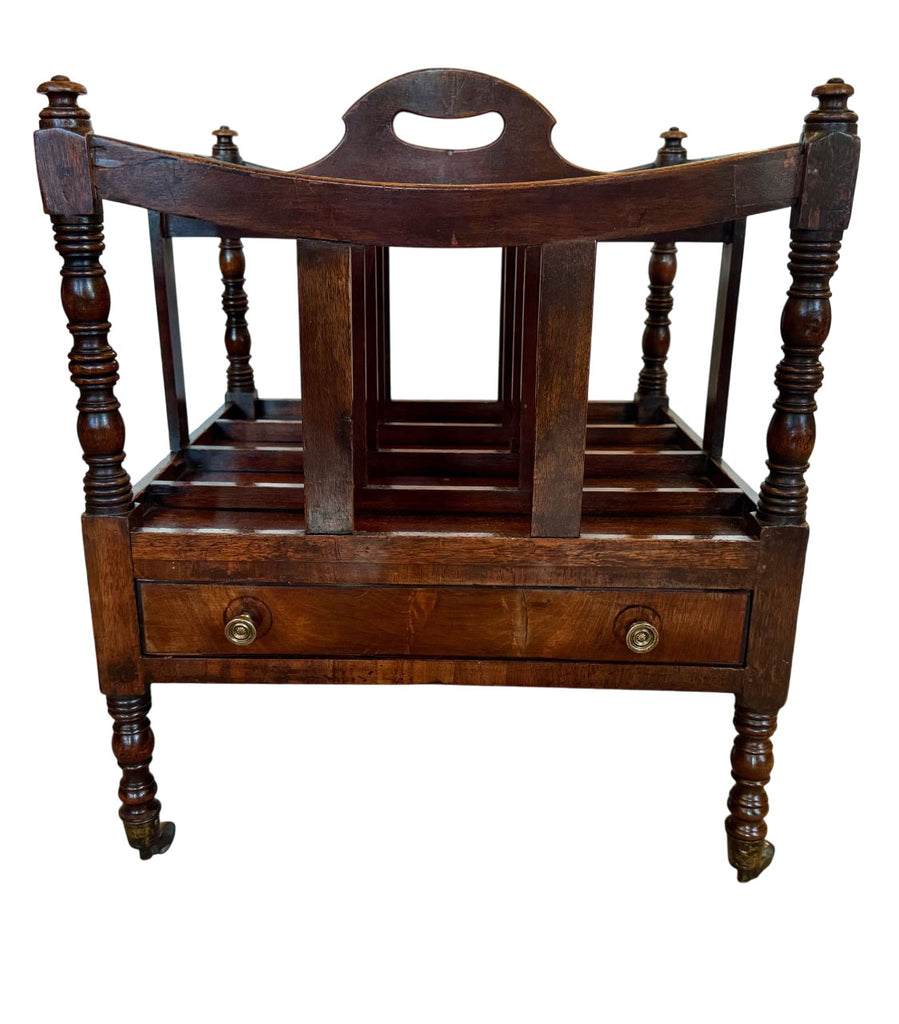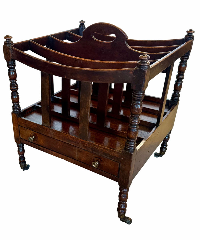 The Canterbury appears early in the 19th century for sheet music and papers and continues until now in some form. This example has neatly turned uprights. It has a single drawer beneath the magazine racks and retains the original cappings and casters. The form is "boat shaped" with the top rail of the dividers bowed to add a touch of elegance.