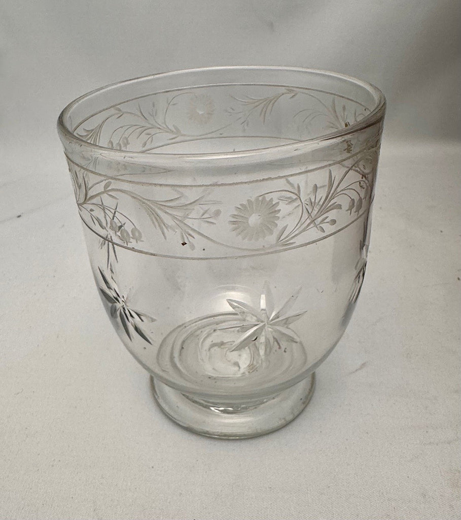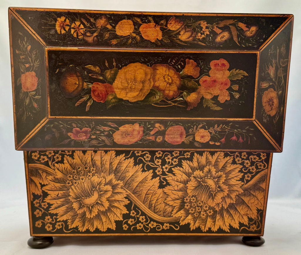 This tea caddy is of sarcophagus form, oblong with a raised panelled lid, painted with autumnal fruit and flowers. The exterior is brilliantly decorated in penwork with stylised flowers, the whole raised on bun feet. The exquisite beauty of the exterior is matched by the craftmanship of the interior. The inside of the lid is dated "Dec 1842". The twin boxes are fully decorated and with hinged covers. They flank a glass mixing bowl that is cut with flowers and stars.  It is both Victorian and unusually appropriate for such a fine box.